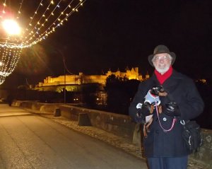 Alan and Sami on the Pont Vieux (Old Bridge) waiting for the Marche aux Flambeaux (Torch March) to arrive. La Cité de Carcassonne in the background.