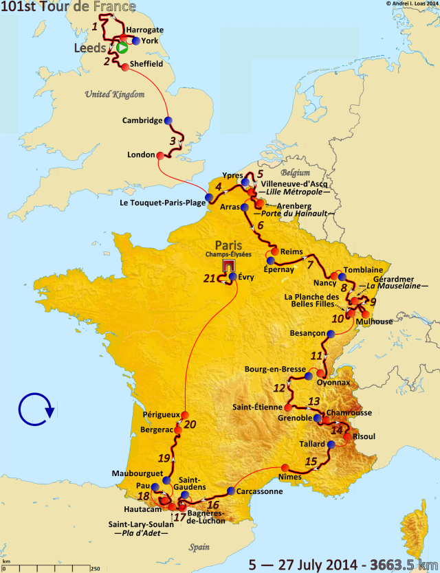 Route of the 2014 Tour de France. (Wikimedia Commons) July 24, 2014July 24, 2014 | Alan Route of the 2014 Tour de France. (Wikimedia Commons)