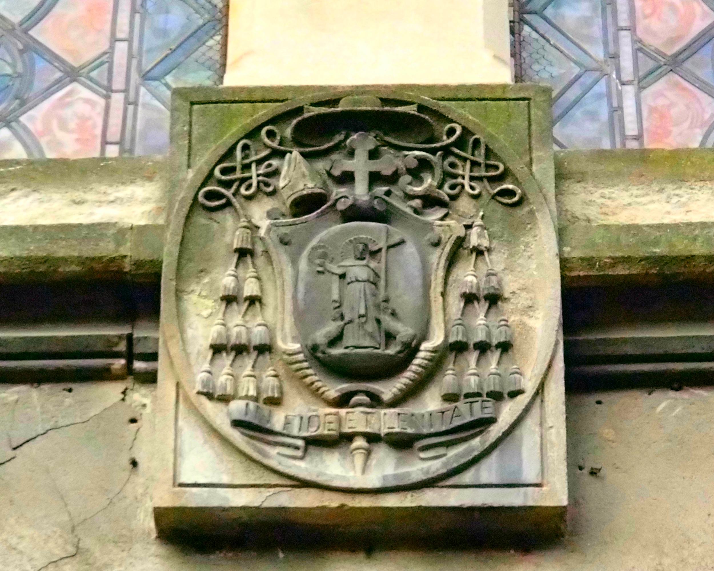 Ornamental lintel with the bishop’s coat of arms above the entrance to the offices of the Diocèse de Carcassonne et Narbonne (Roman Catholic Diocese of Carcassonne and Narbonne). The Diocese was established in 533.