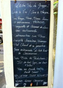 Menu board from the wine bar, Lâche Pas La Grappe on Rue du Pont Vieux. March 23, 2015March 23, 2015 | Alan Menu board from the wine bar, Lâche Pas La Grappe on Rue du Pont Vieux.