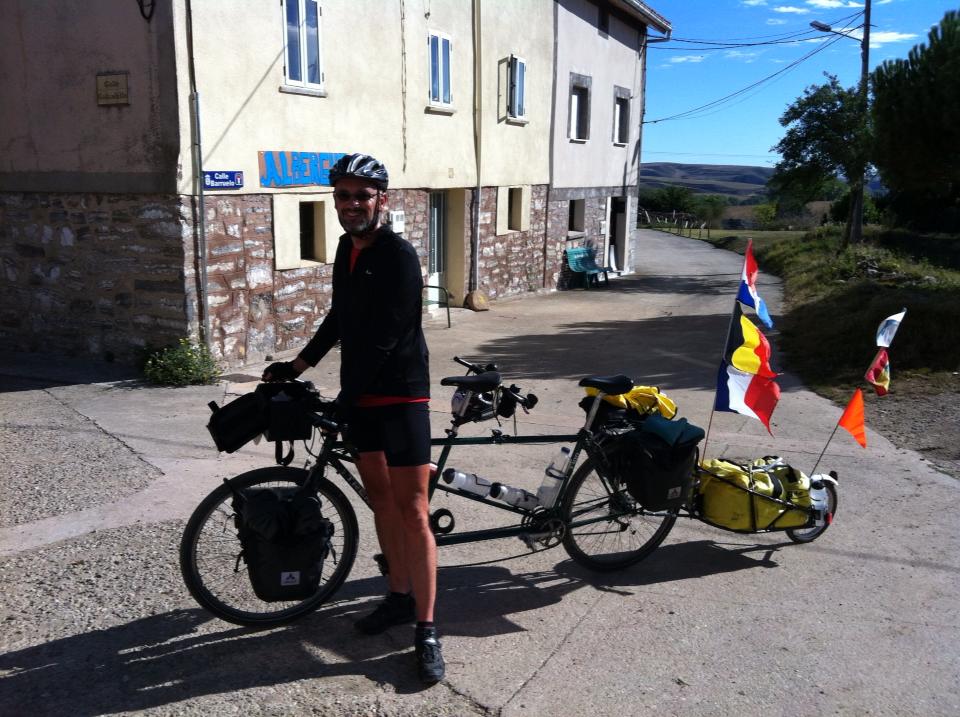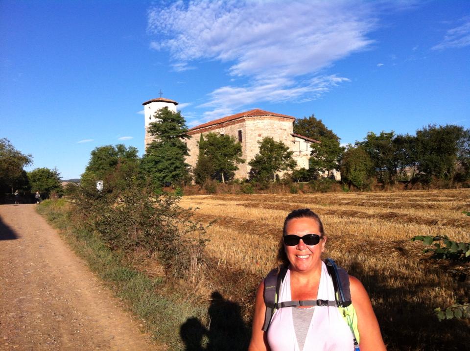 Alan and Tracy at a café very, very close the to N-120 in Villafrana Montes de OcaHappy sunflower near Villafranca Montes de OcaThis distinctive fof the 9th century, Monasterio de San Felix de Oca near Epinosa del CaminoAlan on the footbridge entering Villafranca Montes de OcaFarmland outside of Epinosa del CaminoTandem cyclists with gear, the only ones we saw, in TosantosTracy on foot bridge near Villafranca Montes de OcaFountain in TosantosTracy with the happy sunflowers near TosantosView from the footbridge entrance into Villafanca Montes de OcaErmita de la Virgen de la Pena (la Chiesa) Our Lady of the Rock, near TosantosCafé in TosantosOn the trail toward TosantosYet another method of transportation on the Camino de Santiago, burro with gear, Villafranca Montes de OcaTracy approaching TosantosPilgrim’s fountain in Villambistia, the pool on the opposite side was filled with koiChurch of Santiago, Villafranca Montes de OcaBell tower of the Church of Santiago in Villafranca Montes de OcaGarden wall detail, Villafranca Montes de Oca“Pedal-grino” bike and gear, has cycled from Russia, in Villafranca Montes de Oca11th century pendulum clock, interior of the Church of Santiago, Villafranca Montes de OcaHoly water font made of a large scallop shell, its twin half is said to be in Rome, Chruch of Santiago,Altarpiece, Church of Santiago, Villafranca Montes de OcaDinner with Jeffrey and Michelle at San Anton Abad hostel and hotel