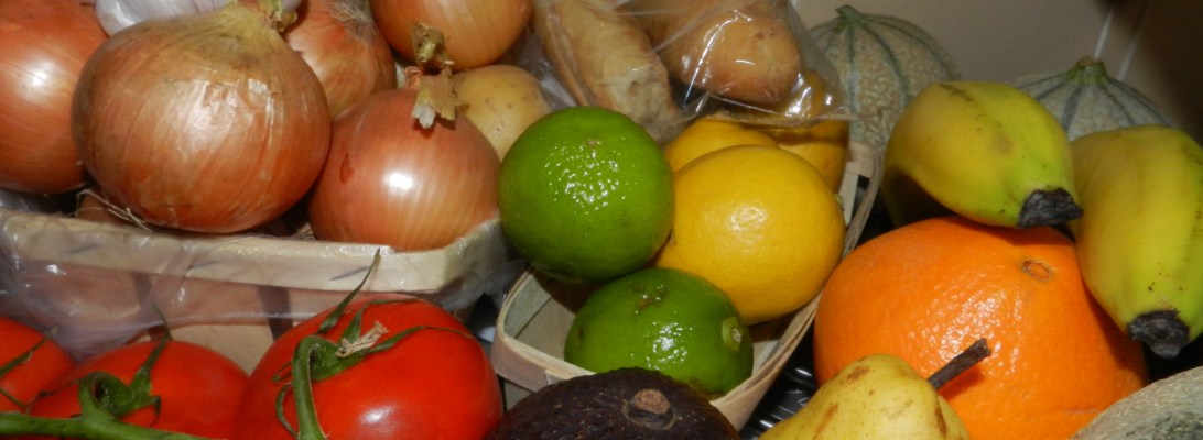 Our latest haul joins last weeks’ leftovers of 4 yellow onions, 5 green chili peppers, 4 carrots, 2 bulbs of garlic, 1 red chili pepper, and 1 pear. We also keep chickpeas, black and brown lentils, spaghetti, rice, tomato sauce, peanut butter, coconut milk, nuts (cashew, pecan, almond – whatever is available), sugar, coffee and tea on hand as staples year round. Last week we also picked up chocolate chips, the mini ones. Baguettes are purchased as needed every few days.